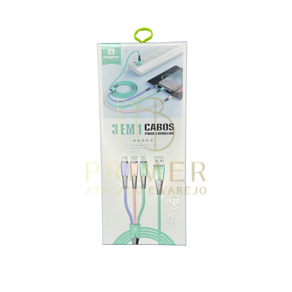 Cabo para carregamento 3 em 1, fornece carregamento rápido para até três dispositivos de conectores diferentes TIPO-C / V8 / lightning, proporcionado facilidade e organização através de apenas um cabo. Cabo de 1.2 metros com amperagem de 2.4 não perdendo a qualidade da carga e proporcionando acesso ao celular com distância maior do carregador. Forte e flexível com grande durabilidade.