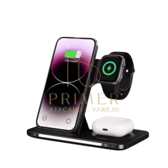 Carregamento sem fio 3 em 1: celular, fones e smartwatch